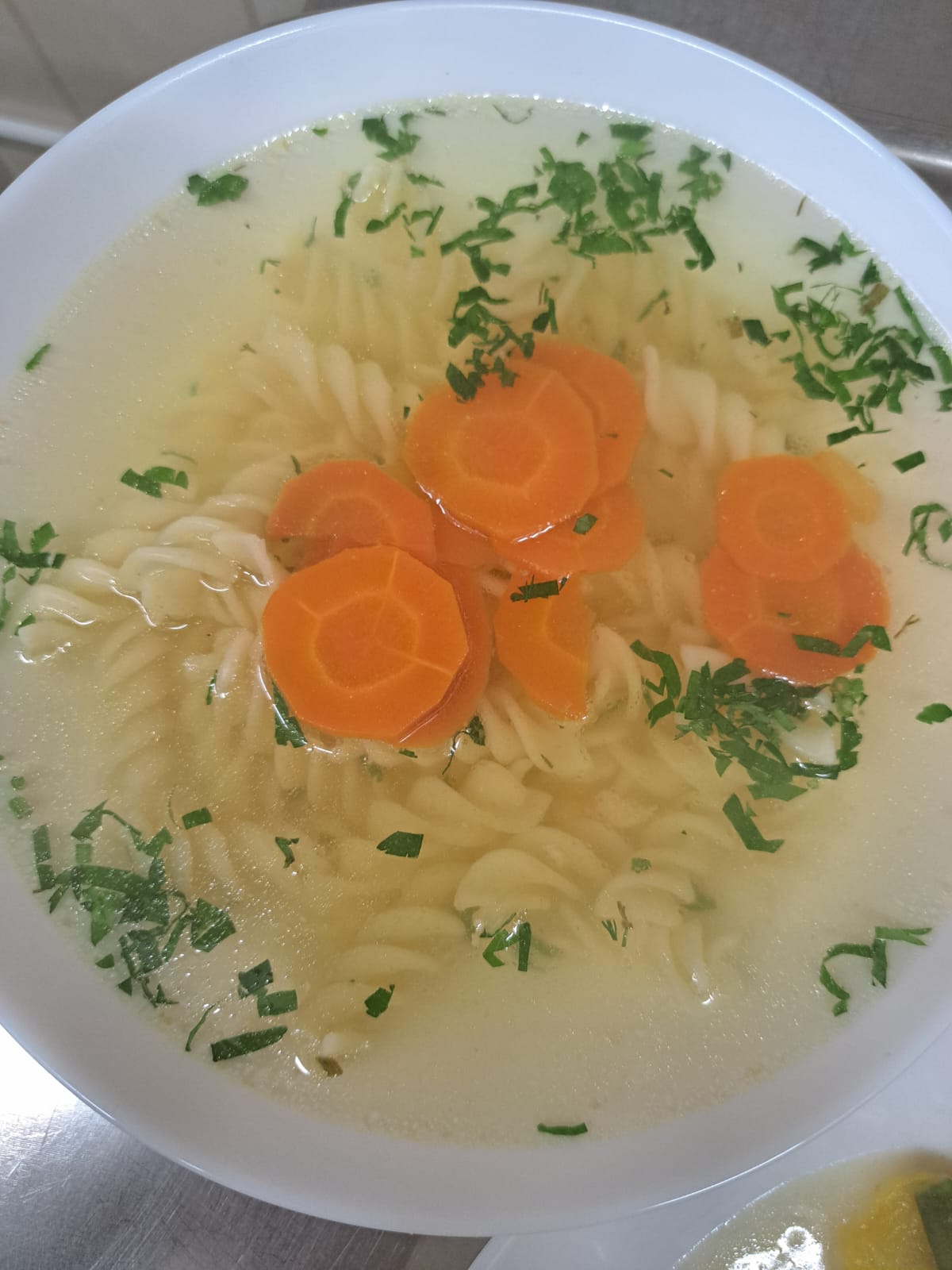 PODWIECZOREK | ZUPA ROSÓŁ Z MAKARONEM (woda, kurczak, makaron nitki marchew pietruszka, seler, por, pietruszka zielona, lubczyk, ziele angielskie, liść laurowy, sól pieprz). (300G), ROGAL (20G), ŚLIWKA (50G) |