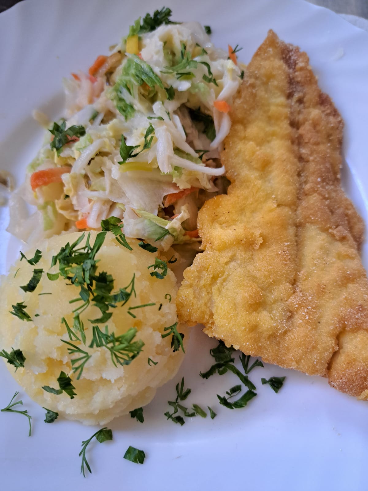 OBIAD | FILET W CHRUPIĄCEJ PANIERCE W SOSIE POMIDOROWYM Z WARZYWAMI ( dorsz, pomidory, marchewka, seler, por, pietruszka, papryka, pieczarki, sól, pieprz) (70G), ZIEMNIAKI (150ML), KOMPOT Z SUSZONYCH OWOCÓW (mieszanka kompotowa, morela suszona, śliwka suszona, żurawina, rodzynki )(150ml), BUDYŃ WANILIOWY (150ML) - WYRÓB WŁASNY |